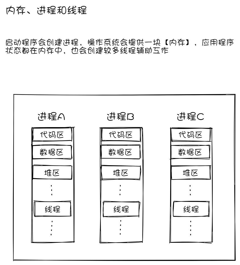 - 下面一图看下内存、进程和线程