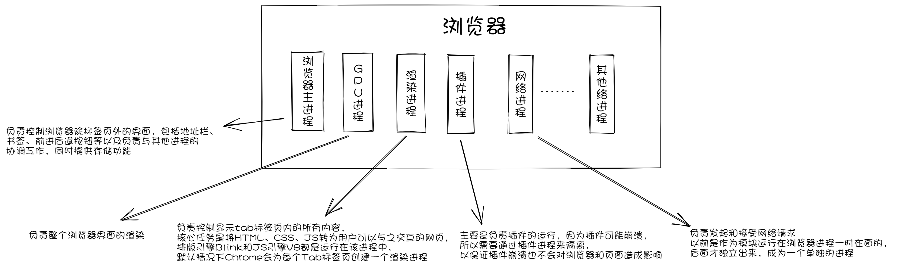 - 责整个浏览器界面的渲染。Chrome刚开始发布的时候是没有GPU进程的,而使用GPU的初衷是为了实现3D CSS效果,只是后面网页、Chrome的UI界面都用GPU来绘制,这使GPU成为浏览器普遍的需求,最后Chrome在多进程架构上也引入了GPU进程