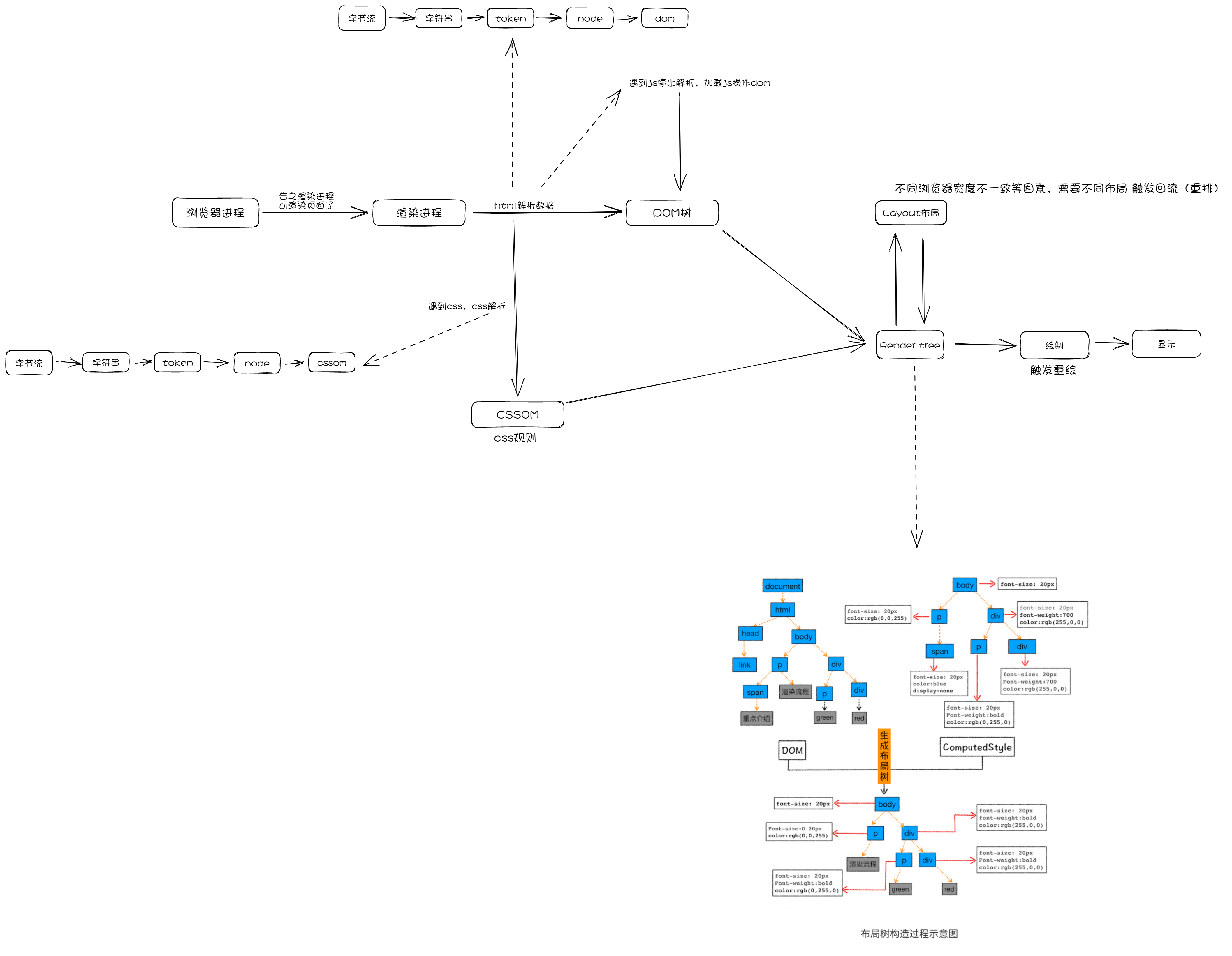 - 然后将DOM Tree 与 Style Rules附加在一起生成渲染树Render Tree(DOM Tree + Style Rules -> Render Tree)