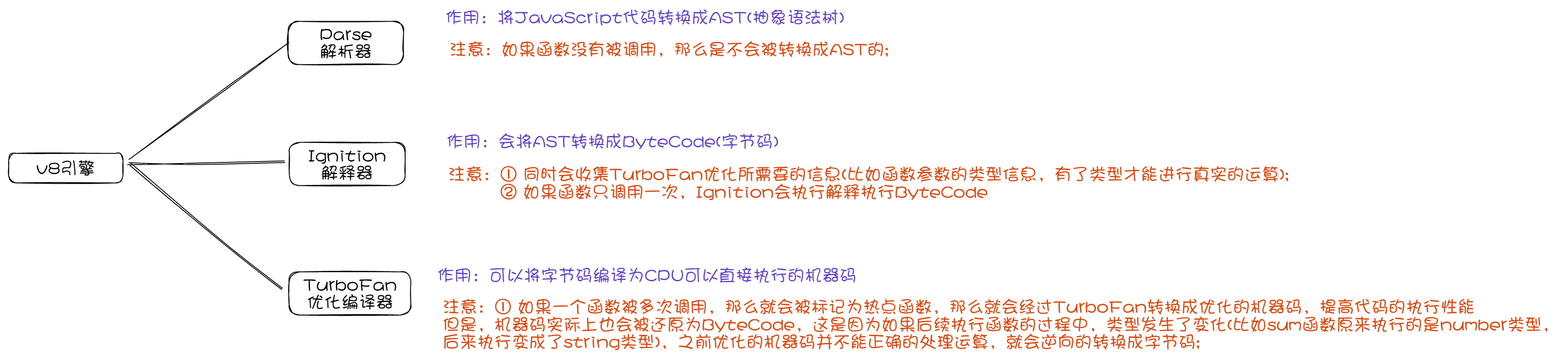 - Ignition库会收集函数执行频率等信息,如果执行频率过多,那么就会由TurboFan库直接变为机器码,就不用先转为字节码,再变为机器指令了(优化)