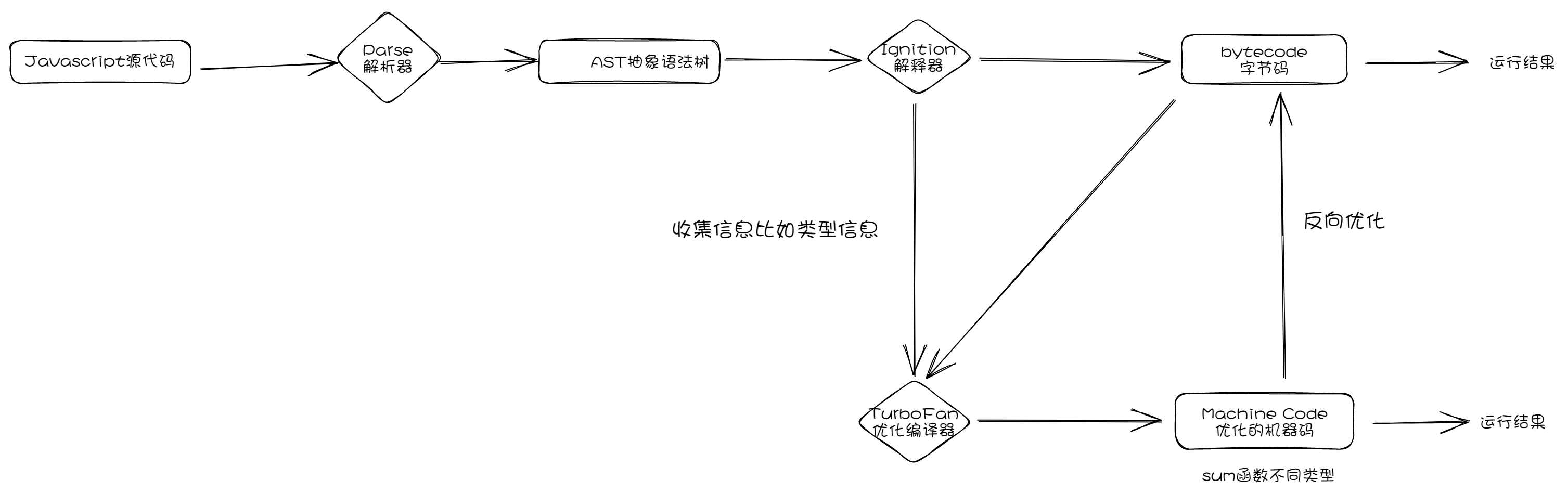 typescriptfunction sum(a,b) { return a+b } sum(1,2) // Number类型的数据 sum(2,3) // Number类型的数据 sum(2,2) // Number类型的数据 // 我们这个sum函数的参数一直是两个Number类型的数据相加,这个函数就会被标记为热点函数,就会经过`TurboFan`转换成优化的机器码 sum(2,'777') // Number类型的数据和字符串相加 // 但是当string类型和 Number类型相加时,之前优化的机器码并不能正确的处理运算,就会逆向的转换成字节码