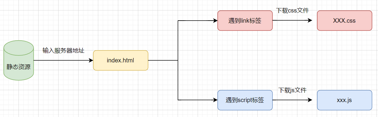 - 浏览器去解析index.html,遇到link标签时去下载css资源,遇到script标签时去下载js文件