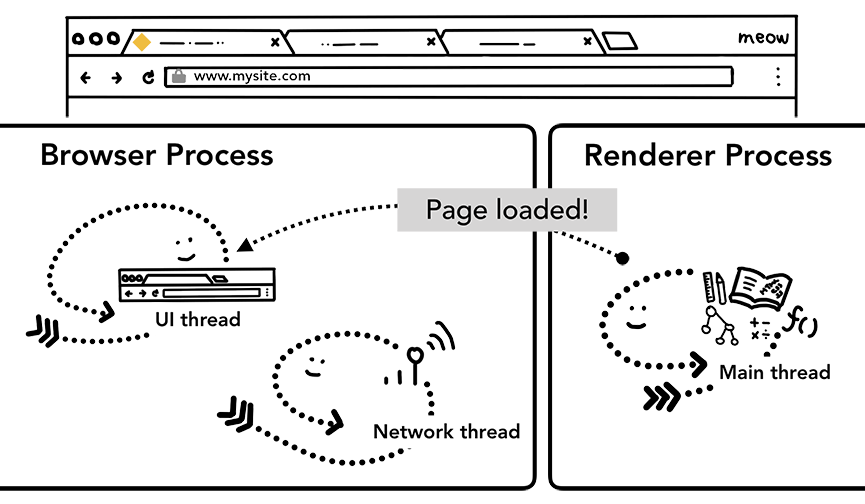 一旦渲染进程完成渲染(load),它会通过IPC告知浏览器进程,然后UI线程就会停止导航栏上的loading