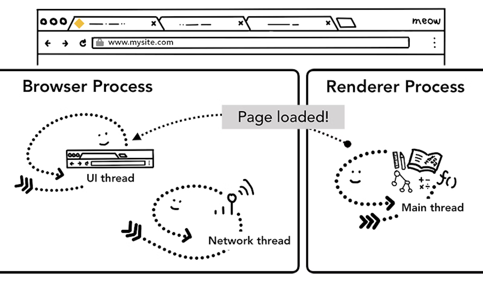 一旦导航别提交,渲染进程开始加载资源和渲染页面,一旦渲染进程渲染完毕,会发送IPC返回给浏览器进程,(这也会所有frameh和onload事件已经触发和执行完毕后发生)。这时,UI线程停止标签页上的加载动画。