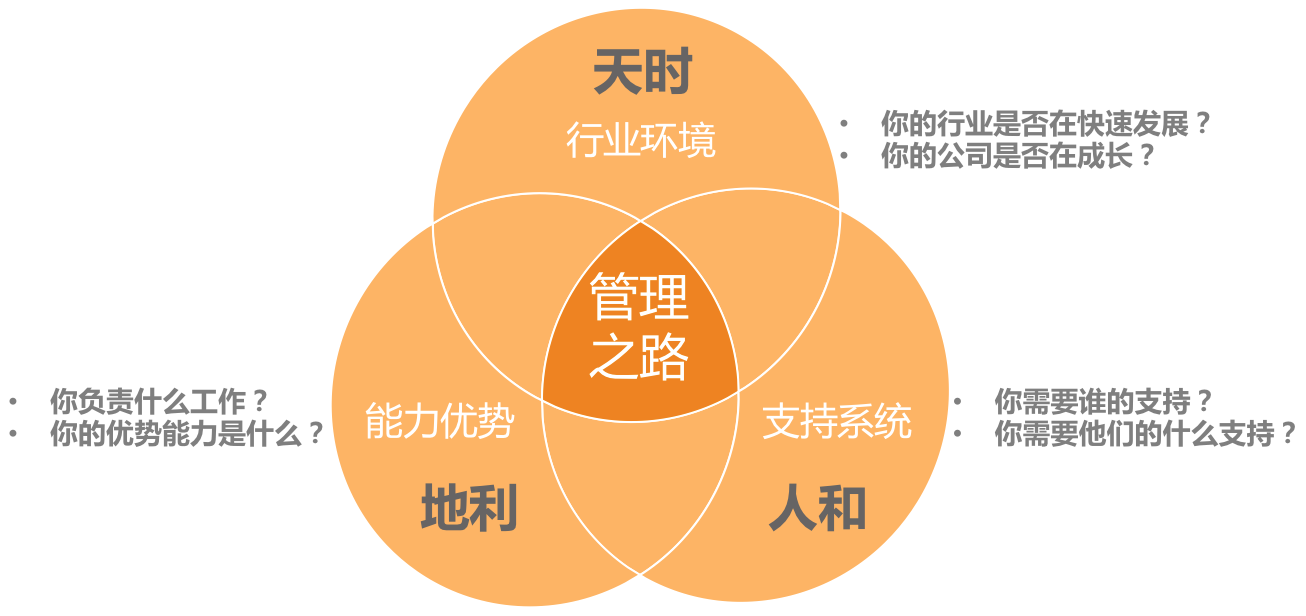 - 天时:做管理的“天时”,其实就是机会、时机、大环境、时代背景。